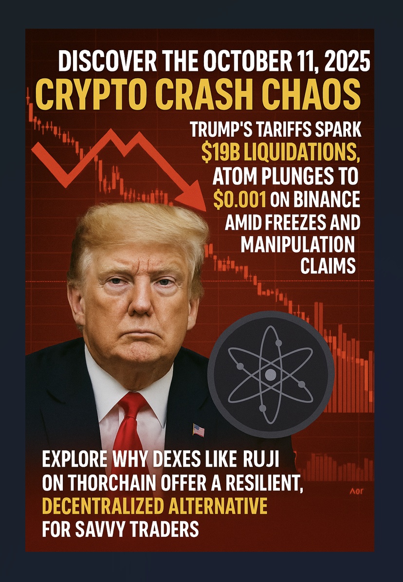 Discover the October 11, 2025 crypto crash chaos: Trump's tariffs spark $19B liquidations, ATOM plunges to $0.001 on Binance amid freezes and manipulation claims. Explore why DEXes like RUJI on THORChain offer a resilient, decentralized alternative for savvy traders.